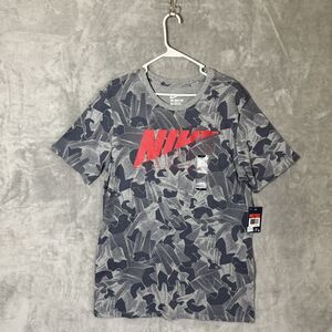 NWT NIKE Shirt L Gray Red White MOVING MOUNTAINS Graphic Spellout Tee Swoosh