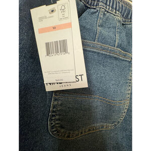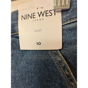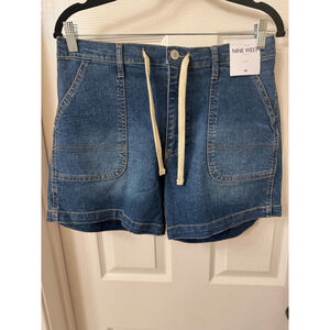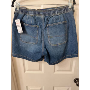 In new condition with tags. The shorts feature a light blue wash, a drawstring waist, and front and back pockets. The material is denim. There are no visible imperfections. The shorts are new with tags.