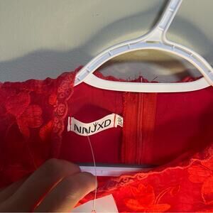 NNJXD Red Lace A-Line Dress with scalloped hem and tulle underlay — event/holiday ready.