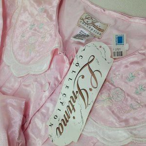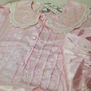 -- L' Intima Collection made in Indonesia, Ladies - M/L (10/12), scalloped pilgrim collar embroidered floral applique, pleated pin tucks bodice with five Button closure, long puffy cuffed sleeves, easy care wash 83% polyester 17% cotton in bright bubblegum pink cream colorway.