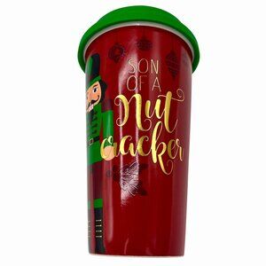 New, festive travel mug with a nutcracker design and Christmas holiday colors, ideal for hot beverages during the season. Metallic gold script.