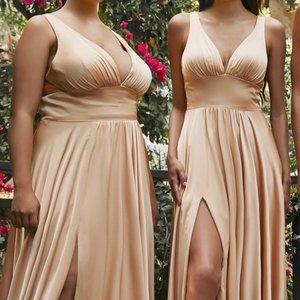 NWT NUDE COLOR PROM PARTY SATIN V-NECKLINE LONG LEG SLIT MAXI GOWN DRESS CD7469