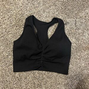 Stylish black racerback sports bra with ruched front detail.still has tags