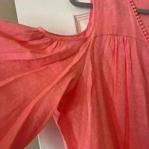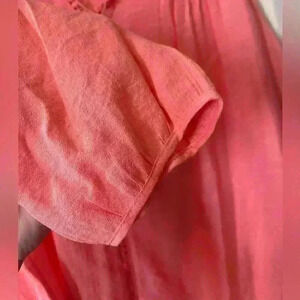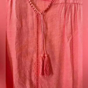 Beautiful coral color! NWT! Never worn, perfect condition! This blouse has small detailed v-neck with cute dropped tassels. Polyester and rayon blend. Elastic at cuffs with cute button. Women’s 2X. Smoke free home. NY Collection
