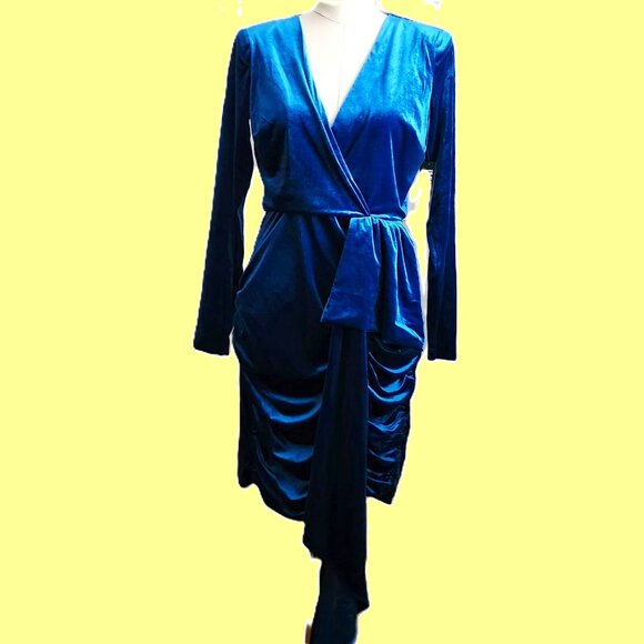 ruched (at sides on skirt area) , surplice neck, approx 32" long from shoulder to the bottom