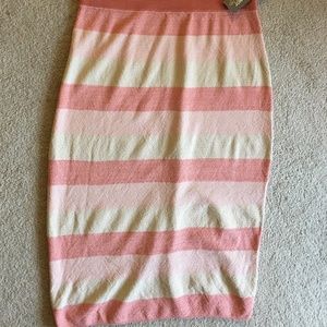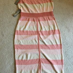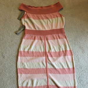 NWT NY&Co Eva Mendes Kristen Stripe Sweater Dress. A very beautiful bodycon. From the exclusive Eva Mendes Collection. Off-the-shoulder neckline. Banded waist. Back vent. Hugs the curves nicely. Size large.