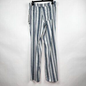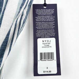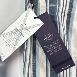 These are a brand new pair of NYDJ (Not Your Daughter's Jeans) trousers, with the original tags still attached. They are made with the brand's signature Lift Tuck Technology which is designed to flatten the front and lift the back for a flattering fit that makes you look and feel a size smaller. The pants are made from a comfortable and breathable stretch linen blend, featuring a classic pinstripe pattern in blue and white. With a clean, straight-leg cut and a flat front, they are a versatile staple for both professional and casual wear.