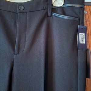 Chic black trousers with stylish leather details. The NYDJ Trousers in Black size 14 feature Lift Tuck Technology to flatten and smooth the tummy. These pants have a flat front seam and a pull-on closure for easy wear. Made of a blend of viscose, nylon, elastane, and spandex, these dress pants are machine washable for convenience. The pants have a straight leg style and come with pockets for added functionality. Perfect for the modern woman looking for slimming and stretchy pants in a classic and urban style. Made in Vietnam. Front usable pockets