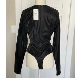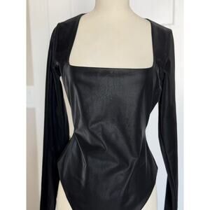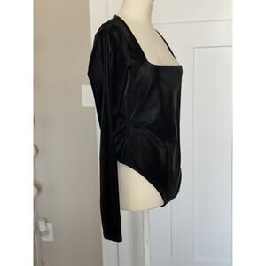 NWT Naked Wardrobe Womens Liquid Faux Suede Square Neck Long Sleeve Bodysuit Black Large