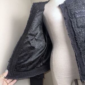 NWT Nanette Lepore Black Sequined Boucle’ Frayed Denim Trim Jacket Tweed Blazer