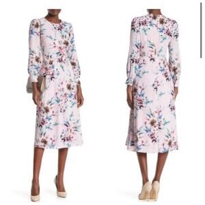 This is a NWT Nanette Lepore Lenore long sleeve floral dress in size 12. The dress features a beautiful floral print throughout. It has a knee-high slit with button detail, adding a touch of elegance. The dress comes in a light purple color and has a midi length, making it perfect for various occasions. This dress is new with tags, ensuring its pristine condition. Don't miss out on this stunning Nanette Lepore dress!