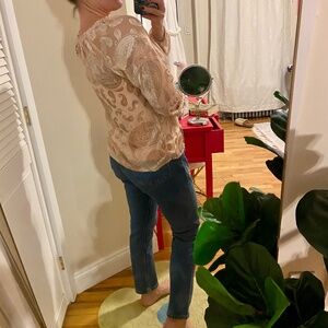 A luxe, semi-sheer paisley devoré top with romantic puff sleeves and a ruched V-notch neckline. Effortlessly glam, floaty and perfect for the holidays or a night out. Comes with matching attached camisole lining.