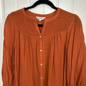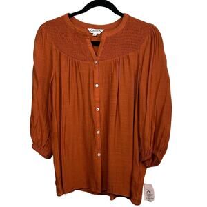 Style tags: puff sleeve blouse, smocked neckline, button front, peasant blouse, boho chic, terracotta, rust colored, elastic cuffs, gathered sleeves, bohemian, prairie style, romantic blouse, autumn colors, oversized fit