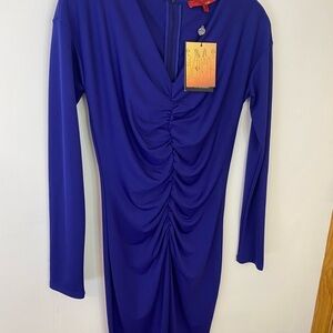 NWT royal blue ruched front long sleeve stretch sheath dress with full back exposed zipper. Gorgeous color. Form fitting and flattering. Size S. Pit to pit measures approximately 17” and length is 28”. (F)