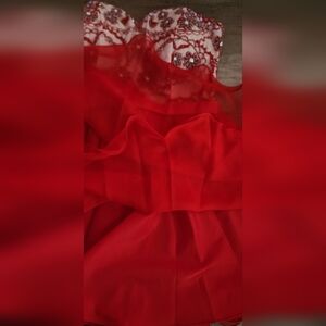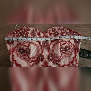 NWT Narianna Prom Jr large Illusion red mini strapless dress ebellished with embroidery, rhinestones, and beads on a cream mesh corset bodice with a cream color lining. Aside from corset sash, it also has a zipper on the back below the waist. Photo with bust measurements is provided. This dress has several layers of 100% polyester chiffon and 100% lining.