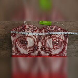 Narianna Prom Illusion Jr XL red mini strapless dress ebellished with embroidery, rhinestones, and beads on a cream mesh corset bodice with a cream color lining. Aside from corset sash, it also has a zipper on the back below the waist. Photo with bust measurements is provided. This dress has several layers of 100% polyester chiffon and 100% lining.