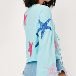 NWT Nasty Gal Blue Icon Starfish Sequins Tie Front Top Size US 4