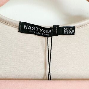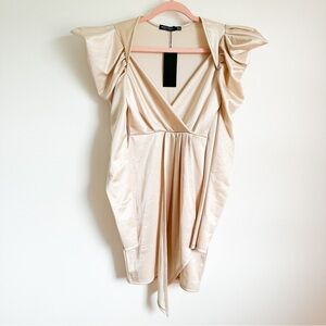 NWT Nasty Gal Champagne Scuba Satin Power Shoulder Draped Dress. Size 0. Unlined. Stretchy. Puff shoulder.