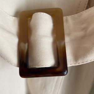 NWT and never worn; Kick pleat in back; Fully lined; Spare button included; Excellent condition; This trench coat features a colorblock design in cream, khaki & gray; oversized, longline silhouette, double breasted, button down closure, notched lapels, belt with buckle closure, pockets at front, and straps at cuffs with buckle closures.