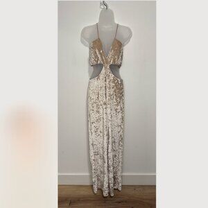New with tags! STUNNING velvet jumpsuit with a shimmery gold fabric. Super comfortable with adjustable straps.