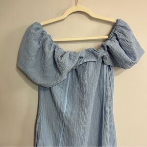 Chic off-shoulder design. Dusty blue hue. Perfect for casual outings.