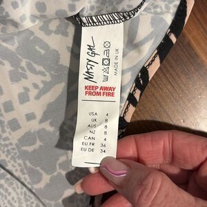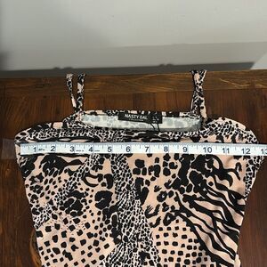 New with tags, Nasty Gal Party Animal Slinky High Leg Bodysuit Size 4. Color nude and black, straps are not adjustable. Bodysuit has two snaps at the bottom. 95% polyester and 5% elastane - machine washable. See pictures for armpit to armpit measurements.