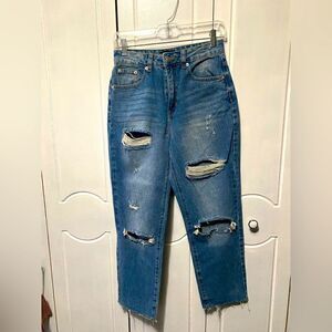 NWT Nasty Gal Too Blessed To Be Distressed Straight Leg Bkue Jeans size 8. Raw hem. Waist approximately 14” flat, rise is 11.5” and length is 25”.
