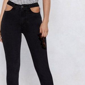 Super cute black jeans originally seen on Nasty Gal. Cut out pockets, mom fit. New with Tags attached