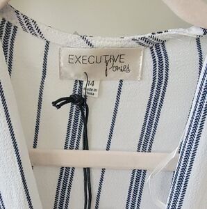 Brand new and never worn striped midi dress in navy blue and white. Purchased from a local boutique. V-neck dress that falls into an elegant wrap at waist. Has pockets! Long sleeves. Lined. Very light and airy material and perfect transition dress for spring and fall. Tags still attached. 100% polyester. Wear with fall knee high boots and a fedora hat for a stylish vineyard look!
