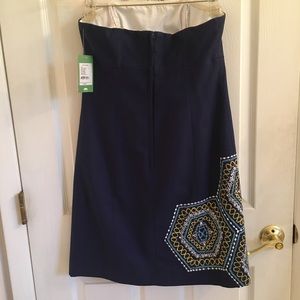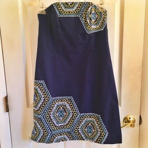 Beat the Summer heat and look good doing it! This strapless Lilly Pulitzer shift features a colorful, geometric embroidered design. Fully lined with a corseted boning. Size 4. Never before worn. New with tags. The Bowen dress in the Bright Navy Honeycomb Home print.