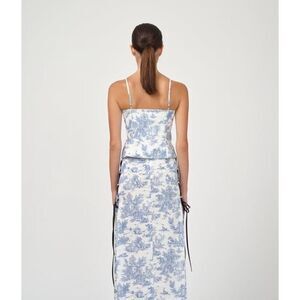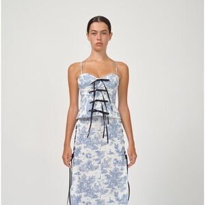 Absolutely stunning and rare Naya Rea “Lily” Corset Top in size UK 8 (US 4). New with tags. Crafted from luxurious 100% cotton sourced from France, featuring the iconic toile du jour blue pastoral print. The structured bodice includes light padding, underwire for support, and adjustable black cotton ribbon ties down the front. Designed in London, Feminine, romantic, and statement-making.