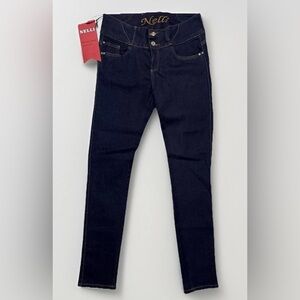 These NWT Nelli Denim Jeans are a stylish and trendy option for tall women looking for a sleek skinny fit. The dark wash denim with rhinestone buttons, sparkly pink logo on back, and bling studs on pockets adds a touch of glamour to these pants. Made from a blend of polyester, spandex, and cotton, these jeans are not only fashionable but also comfortable and versatile for everyday wear. The 30-inch waist size and 32-inch inseam make them a great choice for those in need of a longer length.