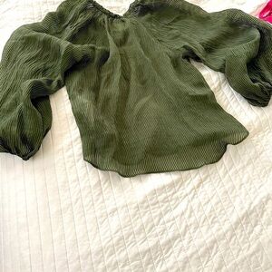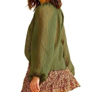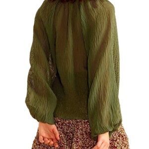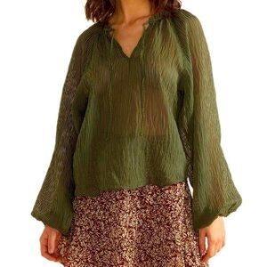 NWT Gorgeous Blouse Sold out Mink pink Brand. Very thin lightweight Viscose/polyester so perfect for Spring /Summer Fashions. Beautiful “Poet Style” balloon sleeves with ruffle collar and tie.