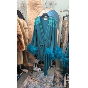 sequin cocktail dress feather cuff marabou ostrich teal cocktail dress emerald green party dress designer dress Italian designer luxury statement dress runway style glamorous showstopper dress new with tags dress NWT sequin feather gown turquoise satin shiny silky blue green mini high-low sach wide sleeves beach birthday wedding guest concert performance unique big discount