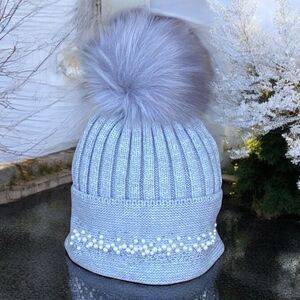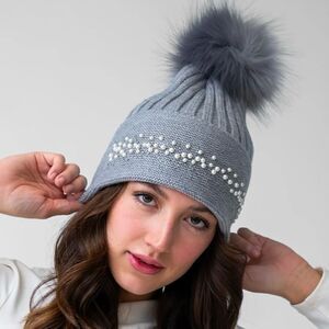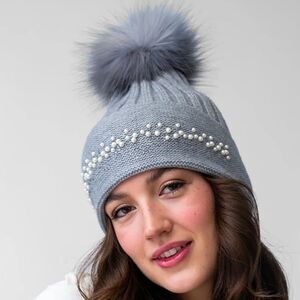NWT New Adrienne Landau Gray Pearl Trim Faux Fur Pom-Pom Knit Beanie Hat OS