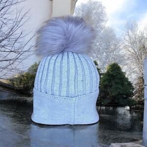 New Adrienne Landau Pearl Trim Faux Fur Pom-Pom Knit Beanie Hat.