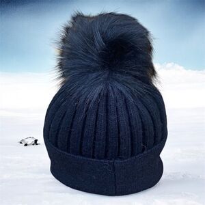 New Adrienne Landau Pearl Trim Faux Fur Pom-Pom Knit Beanie Hat.