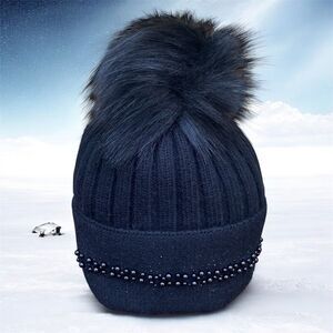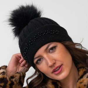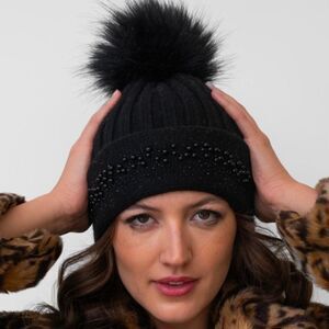 NWT New Adrienne Landau Pearl Trim Pom-Pom Knit Wool Blend Beanie Hat Black OS