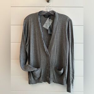 NWT XL heather grey gray Daisy Fuentes button-front cardigan sweater with front pockets and satin trim. Long-sleeves and lightweight. New with tags. 23.5” long (from top of shoulder to bottom hem)