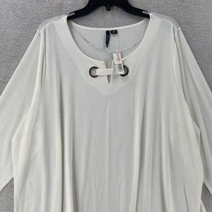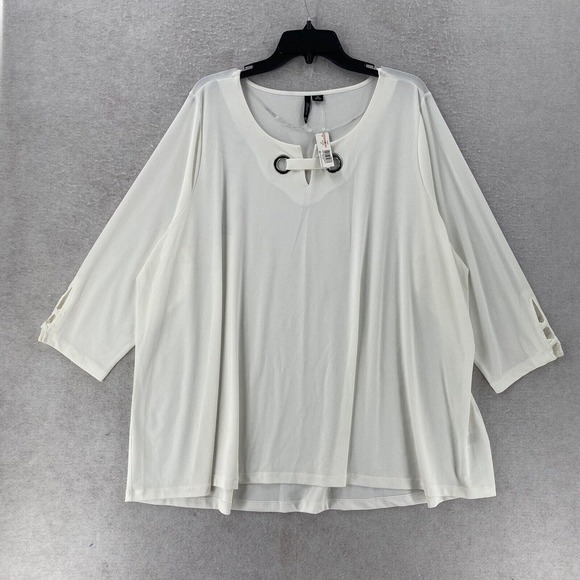 This New Directions blouse is perfect for women looking for a flowy tunic with metal accents and 3/4 sleeves. It's available in size 2X and the white color, with a polyester and spandex material combination, makes it comfortable to wear. The blouse is suitable for petites and can be worn for career purposes.