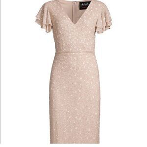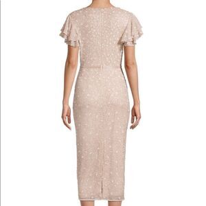 New MAC DUGGAL BEAD RUFFLE SLEEVE MIDI COCKTAIL OYSTER SHEATH DRESS