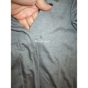 Current new style Missing belt; Sewn up spot; purchased this way. Smooth and drapes; doesn't cling Heather gray Size: Small MSRP: $160