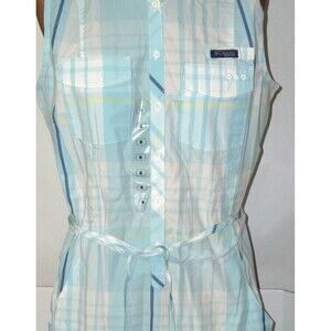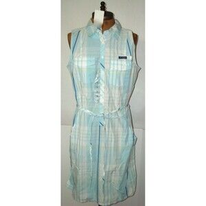 NWT New Womens Columbia White Blue Plaid Dress PFG M Slits Pockets Cotton Logo
