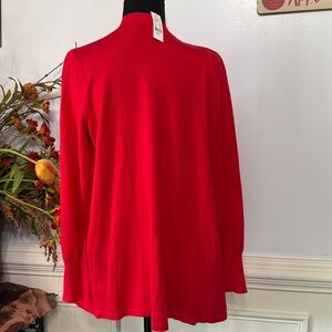 In new excellent condition. Lightweight small knit open front cardigan sweater. Long sleeves with an open waterfall front style. Good amount of stretch to the material. The pit to pit across the back is 18 inches with stretch to 32 inches. Length of sweater is 28 inches on the back And down to 33 inches at the longest point on the front. Beautiful vibrant red that is perfect for the holidays like Christmas and Valentine’s Day, as well as a lightweight sweater while at work or to give a pop-up color.