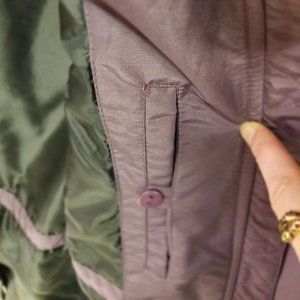 NWT Women's water resistant/light insulated jacket w/color cordinated flannel trim at hood lining and front flap facing. Features: microboa fur inner collar, fashion full collar, hinge zip puller, inside button welt lining pocket, open hand pockets w/ruching detail, snap front flap placket over zip, elastic shaping at back waist. Versatile and beautiful dusty blackberry color w/black trims.