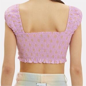 The details: Beautiful silk and cotton blend smocked crop top in lavender with tan polkadots from Intermix.