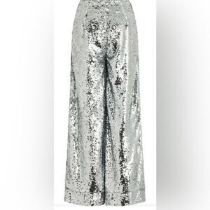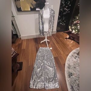 Nichole Lynel brand, new silver, sequin suit, jacket and pants, pants are a wider leg with a zip back, size medium, with tags.
