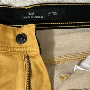This is a pair of NWT Nick Danger slim fit jeans in a vibrant golden yellow color. Made of cotton denim with supreme flex technology, they are designed to provide slimming, comfort, and stretch. The jeans feature a zip closure, have a waist size of 32 inches, and an inseam of 30 inches. The style is skinny, and the brand is Nick Danger.