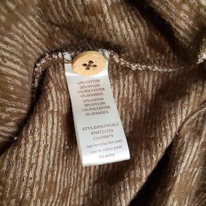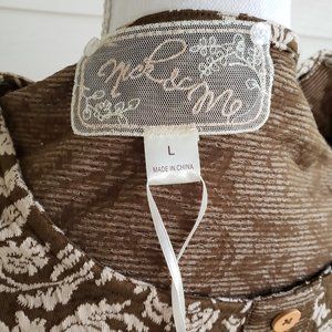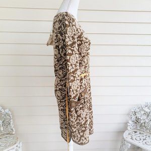 This cute long sleeve tunic style dress is NWT from Nick and Me. Material is 63% Cotton, 20% Nylon, 11% Polyester, and 6% Spandex. Machine washable. It is tagged a size large. The waist tie is gold and I just do not know if that is the original belt. This is what came with it when I bought it. I suppose you could take it off or use something else if you wanted. There are belt loops to hold any in place on the sides. The material has a tapestry look to it however it is a fairly light weight material with a soft touch. Fabric is stretchy. There are also 2 front pockets!