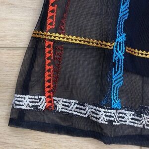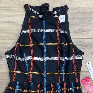 New with tags NWT embroidered mesh primary colors and black window plaid midi halter dress by Nicole Miller New York. A a charming day to night dress perfect for parties and events. A fit and flare silhouette with a sheer mesh overlay shirred skirt. Zipper back closure with a keyhole sash tie neck. Midi length, flawless, Size 10